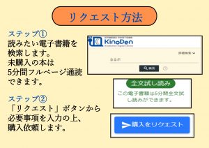 図書館では電子書籍の一層の充実と利用促進のため、「KinoDen」の試し読み&リクエスト募集キャンペーンを開催します。