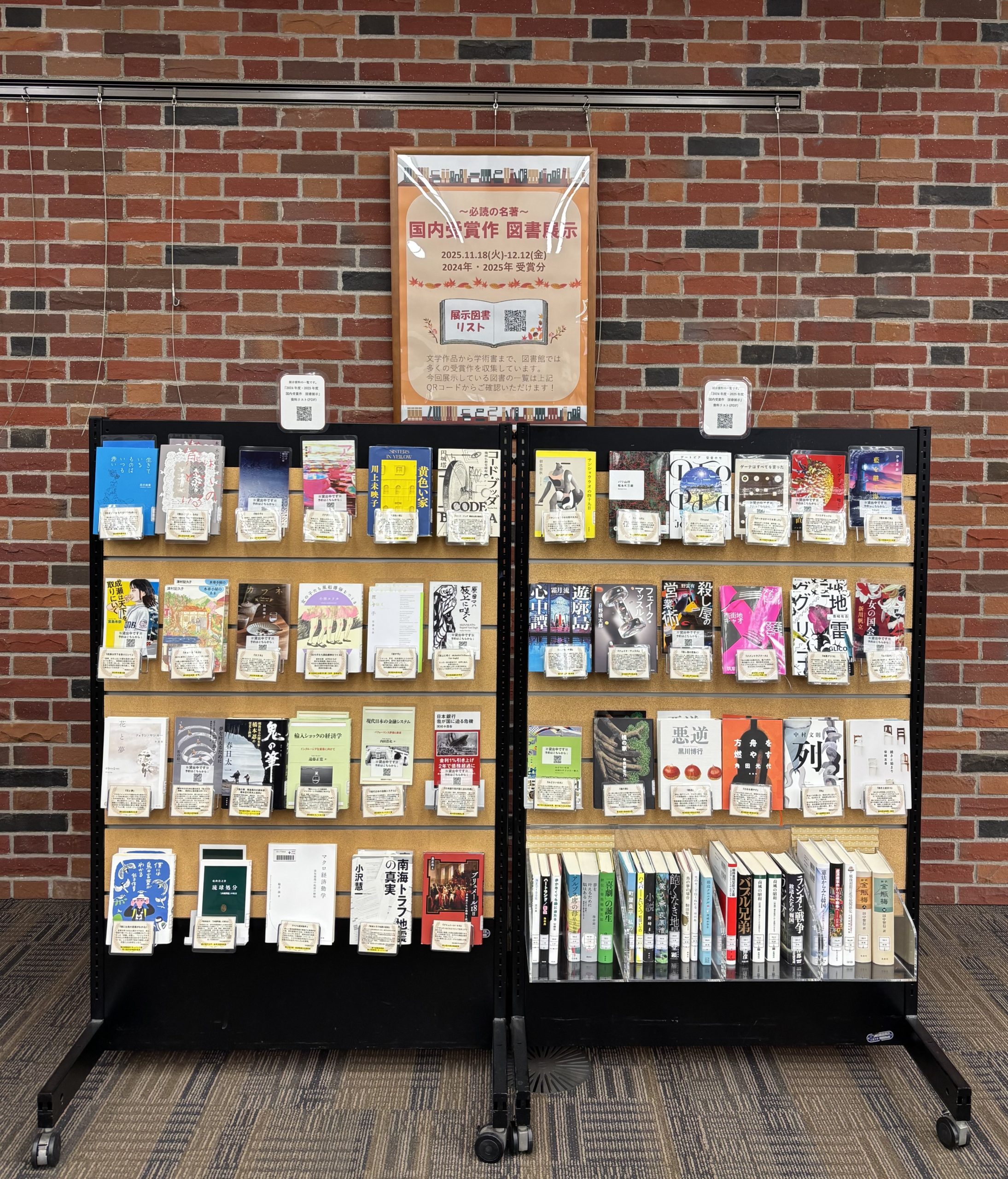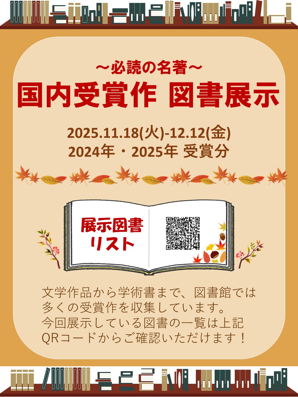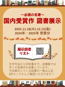 2024年・2025年の国内受賞作品の一部を展示します。文学作品から学術書まで、幅広く展示しています。この機会にじっくり読書はいかがですか? 展示期間:2024年11月18日(火)~12月12日(金)展示場所:池袋図書館1F 新着資料コーナー横スペース 展示図書リストはこちらからチェック ↓ (リストを参考に、新座の皆さんも読書を楽しんでください!)
